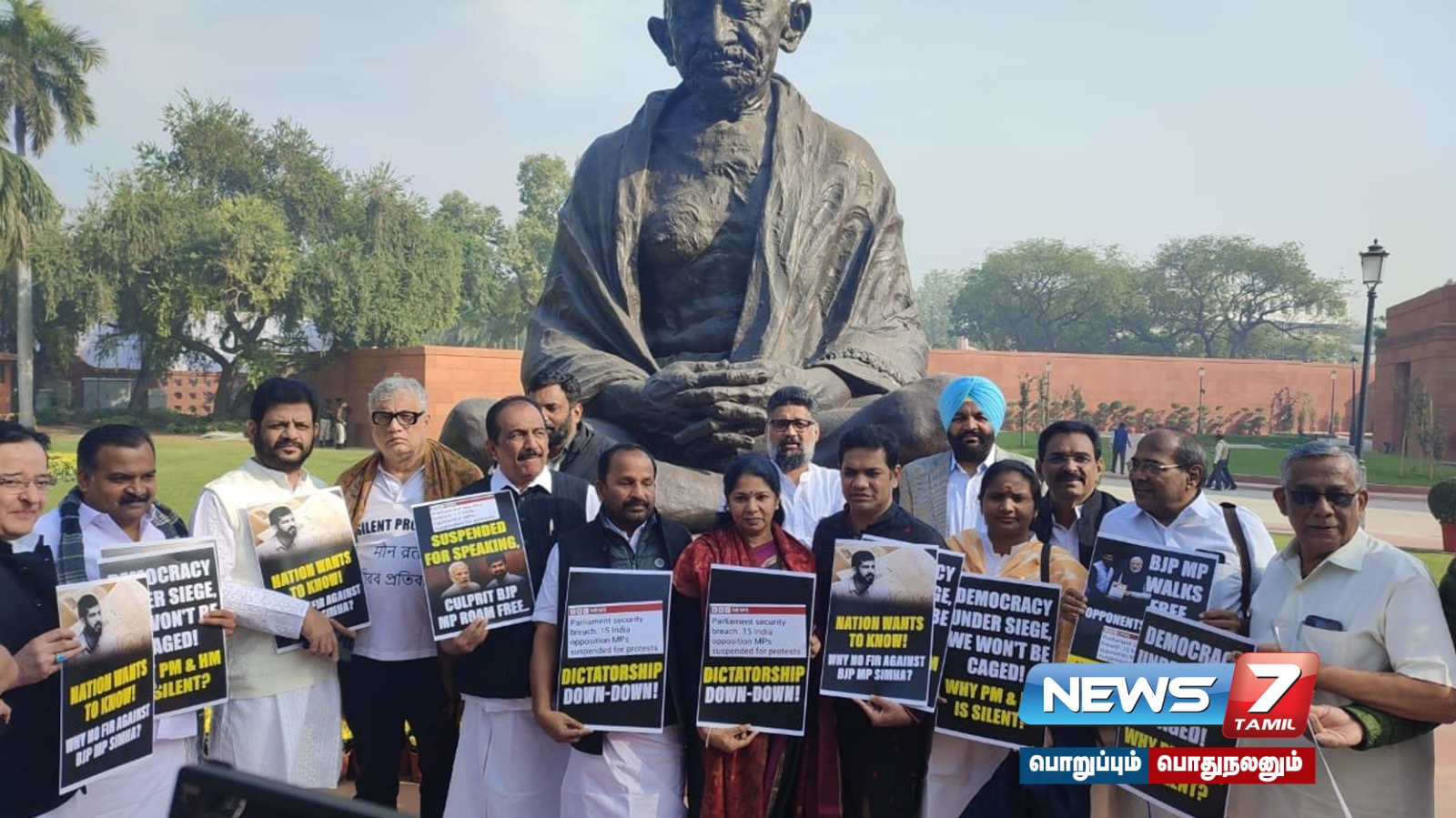 இந்த நிலையில், இடைநீக்கம் செய்யப்பட்ட எம்பிக்கள் அனைவரும், நாடாளுமன்ற வளாகத்தில் இன்று காலையில் போராட்டத்தில் ஈடுபட்டனர்.