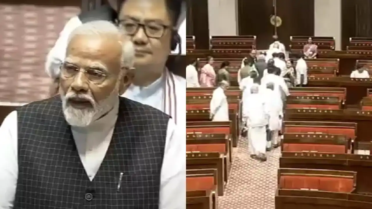அமளிக்கு மத்தியில் பிரதமர் மோடி தொடர்ந்து பேசிய நிலையில், “எதிர்க்கட்சித் தலைவர்.. எதிர்க்கட்சித் தலைவர்” என்றும், “பொய் சொல்வதை நிறுத்துங்கள்” என்றும் எதிர்க்கட்சியினர் முழக்கமிடத் தொடங்கினர். இதனையடுத்து, பிரதமர் மோடியின் பேச்சுக்கு எதிர்ப்பு தெரிவித்து எதிர்க்கட்சி எம்பி-க்கள் மாநிலங்களவையில் இருந்து வெளிநடப்பு செய்தனர்.