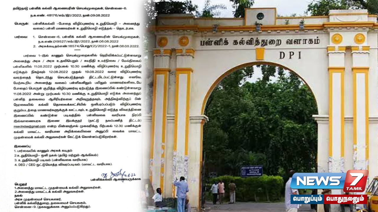 அனைத்து வகை பள்ளிகளிலும் நாளை காலை 10.30 மணிக்கு மாணவர்கள் போதை விழிப்புணர்வு உறுதிமொழி எடுக்க வேண்டும் என பள்ளிக்கல்வித்துறை உத்தரவிட்டுள்ளது.