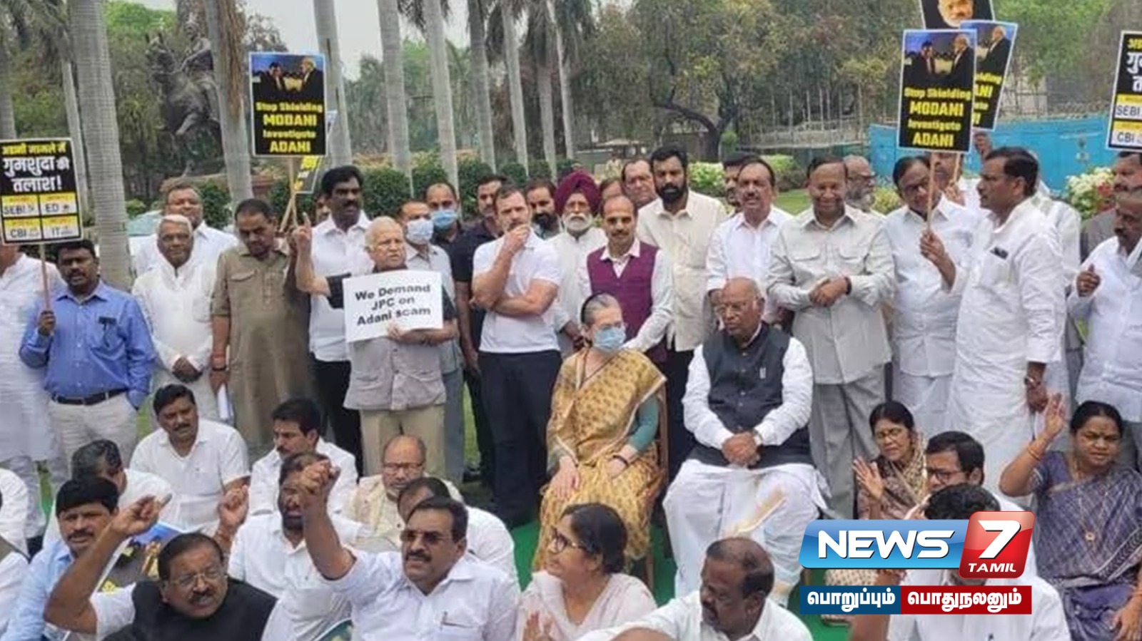 அதானி விவகாரத்தில் நாடாளுமன்ற கூட்டுக்குழு விசாரணை அமைக்கக் கோரி நாடாளுமன்றத்தின் வளாகத்தில் எதிர்க்கட்சிகள் போராட்டத்தில் ஈடுபட்டுள்ளனர். இப்போராட்டத்தில் சோனியா காந்தி, ராகுல் காந்தி, கார்கே உள்ளிட்டோர் பங்கேற்றுள்ளனர்.
