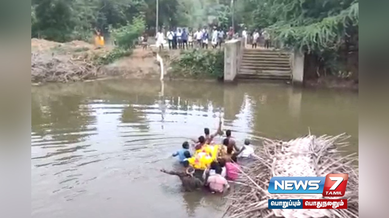 பந்தநல்லூர் அருகே மயானத்திற்கு உரிய பாதை இல்லாததால், மண்ணியாற்றில் இடுப்பளவு தண்ணீரில் இறந்தவரின் உடலை கிராம மக்கள் தூக்கிச் செல்லும் அவலநிலை.