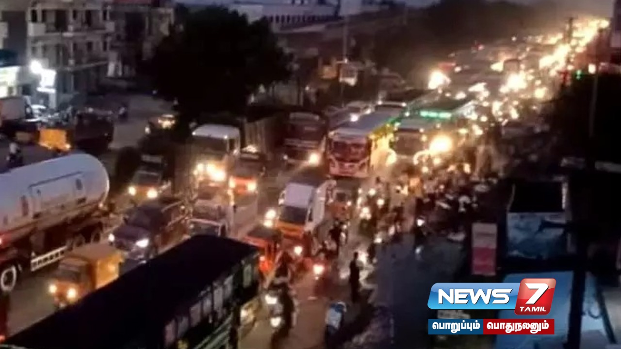 இதனால் இன்று மாலை 3 மணி முதல் சிங்கபெருமாள் கோவில் பகுதியில் கடும் போக்குவரத்து நெரிசல் ஏற்பட்டு உள்ளது. மேலும், ஆம்புலன்ஸ் கூட செல்ல முடியாத அளவிற்கு கடும் போக்குவரத்து நெரிசல் ஏற்பட்டுள்ளது. கடும் போக்குவரத்தை சீர்செய்யும் பணியில் போலீசார் ஈடுபட்டு வருகின்றனர்.