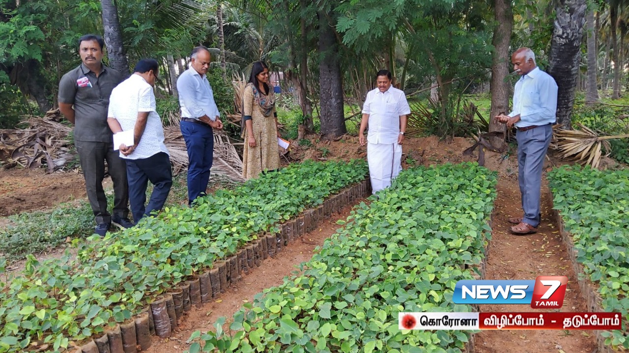 காஞ்சிபுரம் மாவட்டம் குன்றத்தூர் ஒன்றியம் கரசங்கால் ஊராட்சியில் உள்ள நாற்றங்கால் பண்ணையில் தமிழக வனத்துறை அமைச்சர் ராமச்சந்திரன் மாவட்ட ஊராட்சி குழு தலைவர் படப்பை மனோகரன் ஒன்றிய குழு பெருந்தலைவர் சரஸ்வதி, சென்னை மண்டல