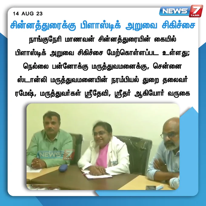 மாணவன் சின்னத்துரையின் கையில் பிளாஸ்டிக் அறுவை சிகிச்சை மேற்கொள்ளப்பட உள்ளது. பிளாஸ்டிக் அறுவை சிகிச்சை மேற்கொள்ள நெல்லை பன்னோக்கு மருத்துவமனைக்கு, சென்னை அரசு ஸ்டான்லி மருத்துவமனையின் நரம்பியல் துறை தலைவர் ரமேஷ், மருத்துவர்கள் ஸ்ரீதேவி, ஸ்ரீதர் ஆகியோர் வருகை தந்துள்ளனர்.