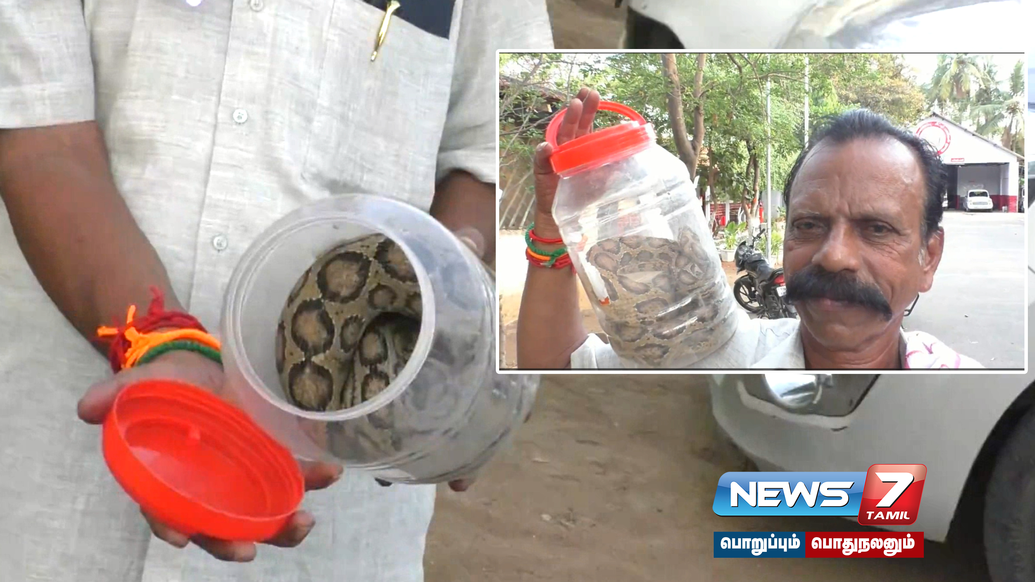 கரூர் அடுத்துள்ள வெங்கமேடு விவிஜிநகர் பகுதியினை சார்ந்தவர் லோகநாதன் (வயது60). இவர் தனது வீட்டின் அருகே உள்ள பூங்குயில் நகர் பகுதியில் உள்ள ஒரு வீட்டின் சந்தில் விஷம் கொண்ட விரியன் பாம்பு இருந்ததை கண்டறிந்து மக்களை காப்பாற்றும் வண்ணம் தானாகவே பாம்பு பிடி வீரராக மாறி, சுமார் 20 நிமிடமாக போராடி அந்த பாம்பினை லாவகமாக பிடித்து அதனை பிளாஸ்டிக் டப்பாவில் அடைத்துள்ளார்.