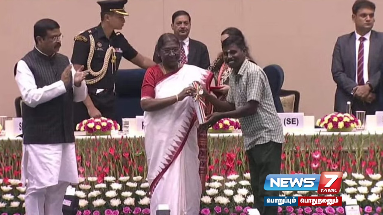 ஆசிரியர் தினத்தை முன்னிட்டு தேசிய அளவில் நல்லாசிரியர் விருது வழங்கும் விழா டெல்லியில் உள்ள விஞ்ஞான் பவனில் நடைபெற்றது. இந்த நிகழ்ச்சியில் கலந்துகொண்டு, தமிழகத்தைச் சேர்ந்த ஆசிரியர் ராமச்சந்திரன் உள்பட 46 பேருக்கு தேசிய நல்லாசிரியர் விருதுகளை குடியரசு தலைவர் திரௌபதி முர்மு வழங்கினார்.