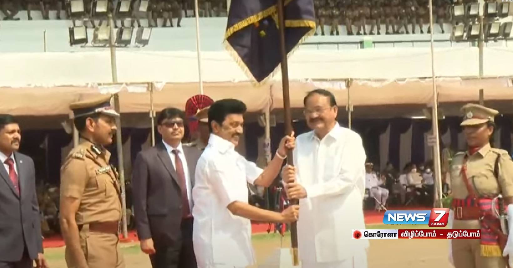 சென்னை எழும்பூரில் ராஜரத்தினம் மைதானத்தில் நடைபெற்ற நிகழ்வில், முதலமைச்சர் மு.க.ஸ்டாலினிடம் கொடியை ஒப்படைத்தார் குடியரசு துணைத் தலைவர் வெங்கையா நாயுடு.
