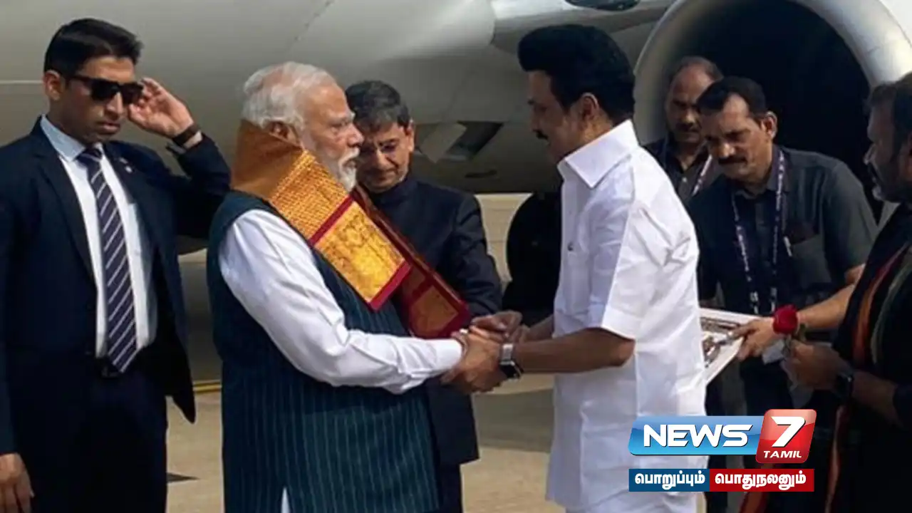 இதற்காகப் பிரதமர் மோடி டெல்லியிலிருந்து இன்று காலை 10 மணிக்கு தனி விமானத்தில் திருச்சி விமான நிலையம் வந்தடைந்தார். அவரை, ஆளுநர் ஆர்.என்.ரவி, முதலமைச்சர் மு.க.ஸ்டாலின் ஆகியோர் வரவேற்றனர்.