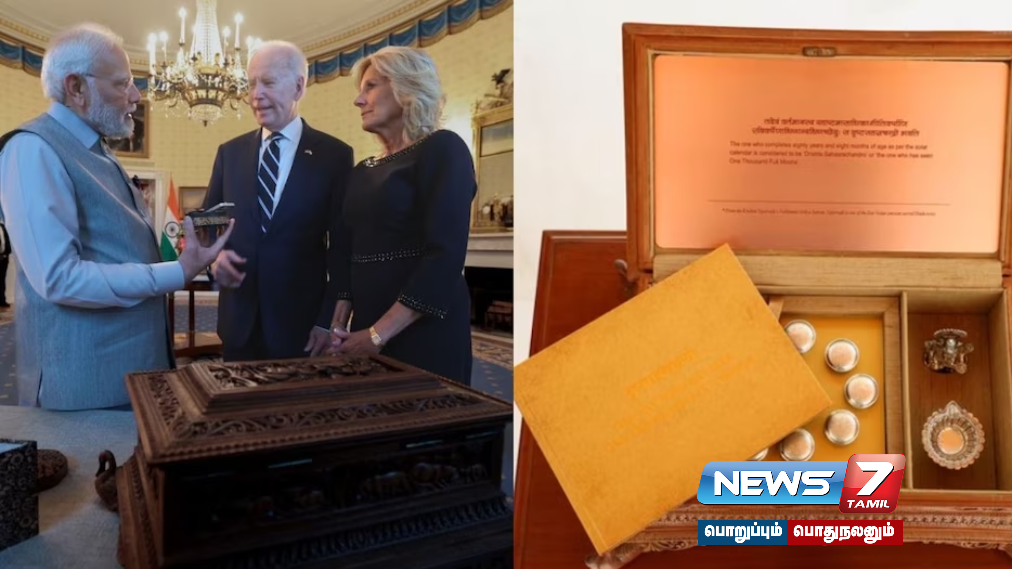 அதேபோல் அதிபர் பைடனுக்கு பிரதமர் மோடி வழங்கிய சந்தனப் பெட்டியில் இடம்பெற்ற பரிசுப் பொருட்களின் விவரங்களை தற்போது பார்க்கலாம்…