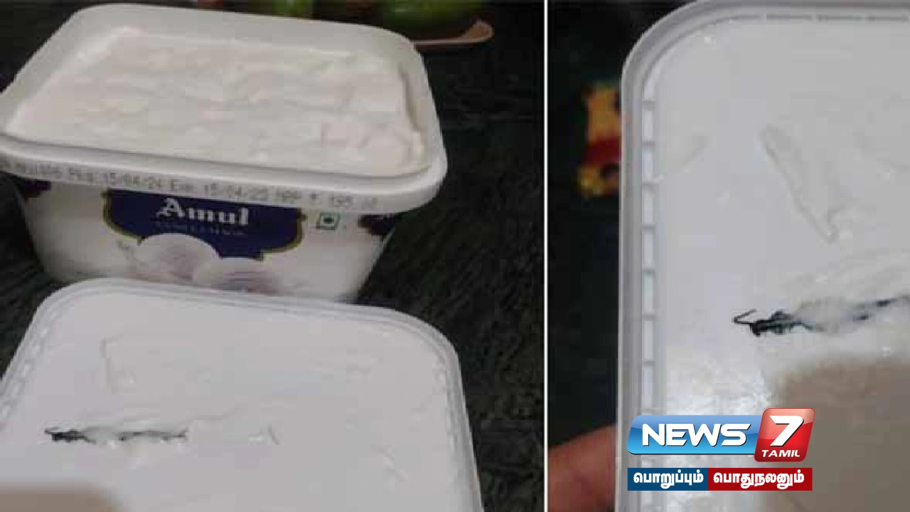 உத்தரப் பிரதேச மாநிலம், நொய்டாவைச் சேர்ந்த தீபாதேவி என்ற பெண் தனது 5 வயது மகனுக்கு மாம்பழ மில்க் ஷேக் செய்வதற்காக ஆன்லைன் டெலிவரி தளமான ப்ளிங்கிட் மூலம் அமுல் ஐஸ்கிரீமை ஆர்டர் செய்திருக்கிறார். ஐஸ்கிரீம் டெலிவரி செய்யப்பட்டதும் அதனை திறந்து பார்த்துள்ளார். அதனை திறந்தவுடன் ஐஸ்கிரீமுடன் உறைந்திருந்த பூரானைக் கண்ட தீபா தேவி அதிர்ச்சியடைந்துள்ளார்.