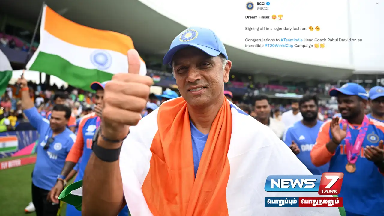 இந்திய கிரிக்கெட் அணியின் பயிற்சியாளராக ராகுல் டிராவிட் தனது கடைசி போட்டியில் இணைந்திருந்தார். மிகவும் முக்கியத்துவம் வாய்ந்த இந்த போட்டியில் அணியை வெற்றி பெற வைத்ததோடு, 17 ஆண்டு கனவை நனவாக்கியதோடு, 11 ஆண்டுக்கு தண்ணி காட்டி வந்த ஐசிசி கோப்பையை வென்று கொடுத்து ஒட்டு மொத்த நாட்டு மக்களையும் மகிழ்ச்சிபடுத்தியுள்ளார். தற்போது வெற்றியுடன் இந்திய அணியின் பயிற்சியாளர் பதவியில் இருந்து விடைபெறுகிறார்.