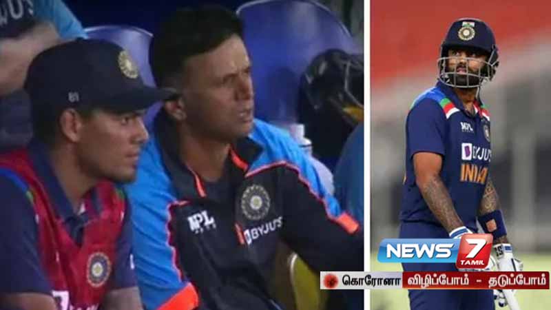 இந்த போட்டி நடந்துகொண்டிருந்தபோது சிறப்பாக ஆடிக்கொண்டிருந்த சூரியகுமார் யாதவ் அரைசதம் அடித்த பிறகு தனது விக்கெட்டை பறிகொடுத்தார். இதை கவனித்துக் கொண்டிருந்த பயிற்சியாளர் ராகுல் டிராவிட், ’என்ன இப்படி விக்கெட்டை பறிகொடுத் துட்டாரே’ என்றபடி ரியாக்ஷன் கொடுத்தார். அந்த ரியாக்ஷனை சமூக வலைதளங் களில் ரசிகர்கள் பகிர்ந்து வருகின்றனர்.