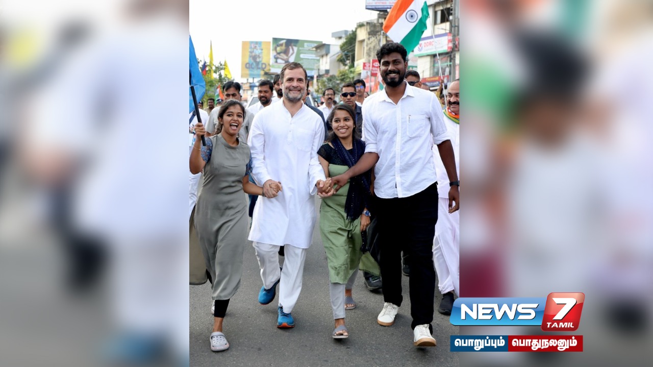 பின்னர் களியக்காவிளை அருகே உள்ள தலச்சன்விளையில், கடந்த சனிக்கிழமை தமிழ்நாடு பயணத்தை ராகுல் காந்தி நிறைவு செய்தார். கன்னியாகுமரி மாவட்டத்தில் அவர் 4 நாட்களில் 56 கிலோமீட்டர் தூரம் நடந்துள்ளார். இங்கு நடைபயணத்தை முடித்ததும் ராகுல் காந்தி கார் மூலம் தமிழகம் – கேரள எல்லையில் உள்ள செருவாரகோணம் பகுதிக்கு சென்று இரவில் தங்கினார். அதன்பின் நேற்று காலை அங்கிருந்து காரில் புறப்பட்ட அவர் பாறசாலை பகுதிக்கு சென்றார்.