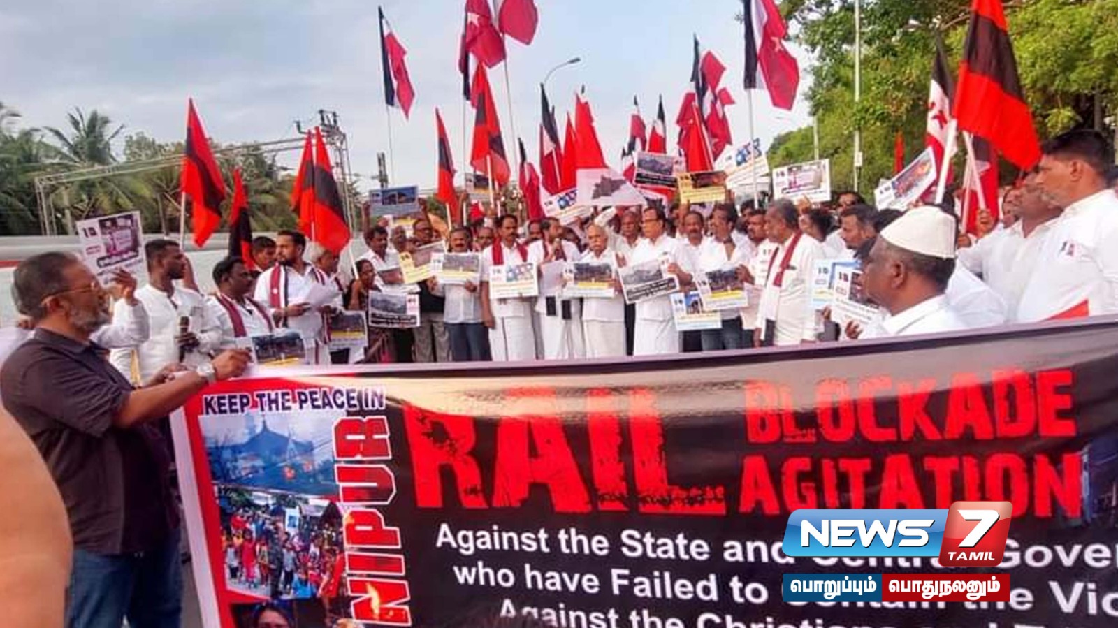 மணிப்பூரில் அமைதியை நிலைநாட்ட வலியுறுத்தி மனிதநேய ஜனநாயக கட்சி சார்பில் சென்னை எழும்பூரில் ரயில் மறியல் போராட்டம் நடைபெற்றது.