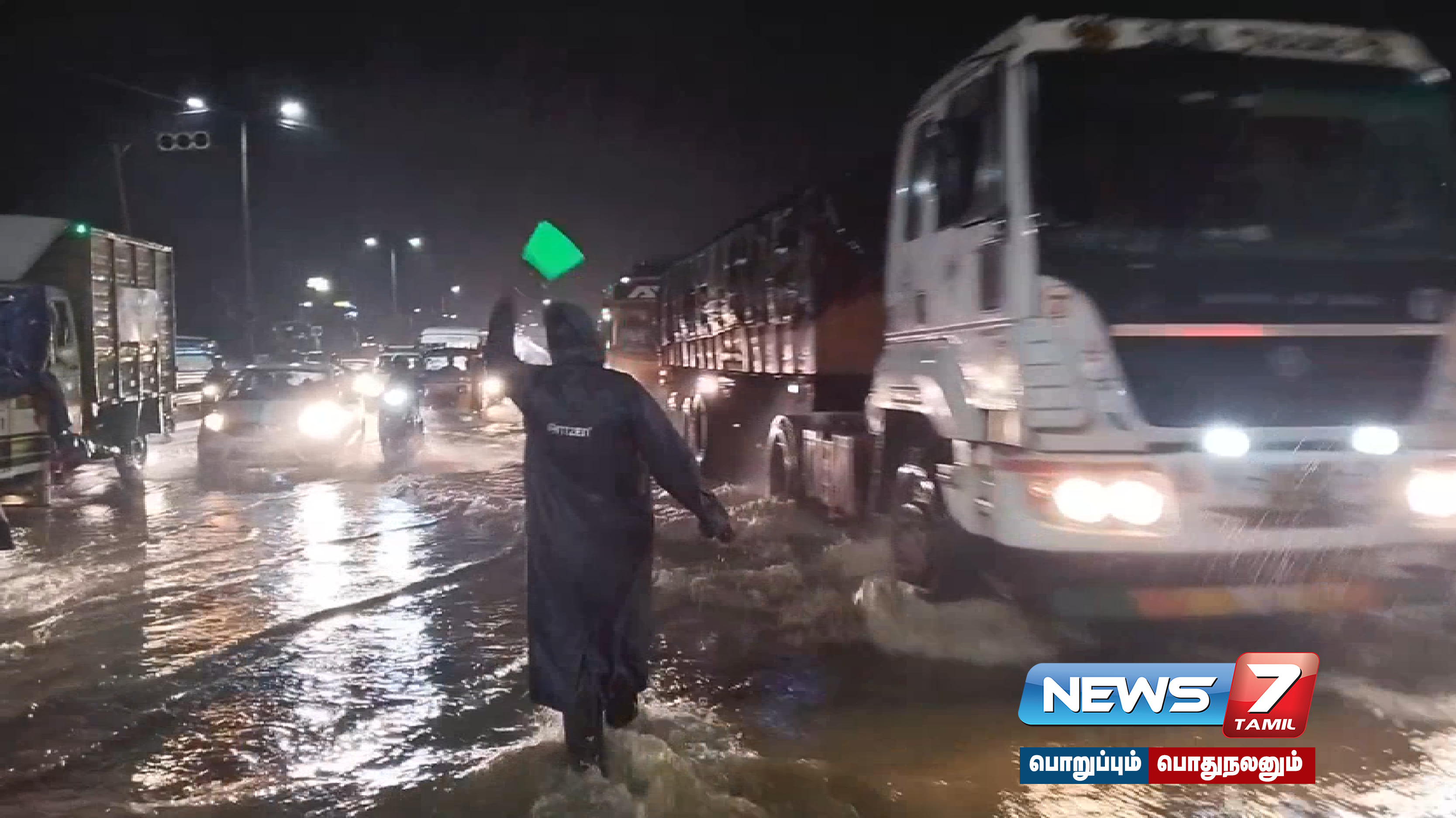 புறநகரில் பெய்த கனமழையால் வண்டலூர் ஜி.எஸ்.டி.சாலையில் குளம்போல் தண்ணீர் தேங்கியது.