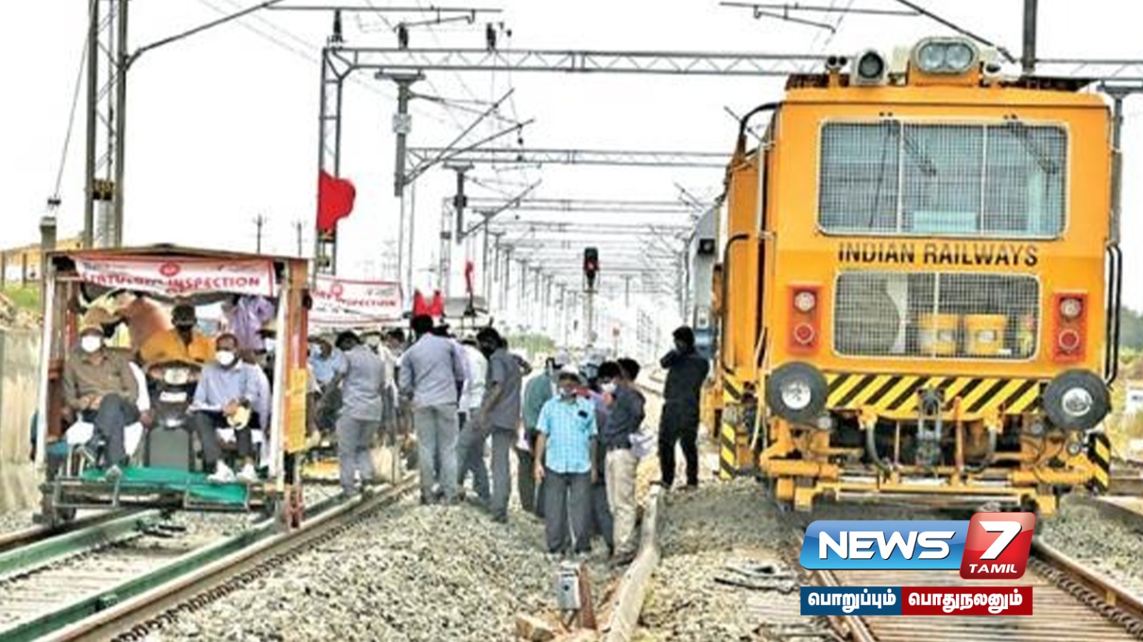 ராஜபாளையம் ரயில் நிலையத்தில் மேம்படுத்தபட்ட மின்சார வழித்தடத்திற்கான பணிகள் மற்றும் பாதுகாப்பு அம்சங்கள் குறித்து தெற்கு ரயில்வே மூத்த அதிகாரிகள் ஆய்வு மேற்கொண்டனர்.