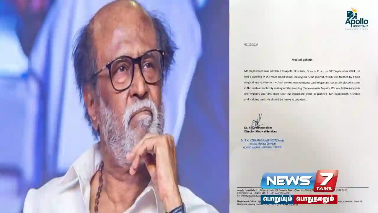 “சென்னை அப்பல்லோ மருத்துவமனையில் செப்டம்பர் 30-ஆம் தேதி நடிகர் ரஜினிகாந்த் அனுமதிக்கப்பட்டார். அவரது இதயத்துக்கு செல்லும் முக்கிய ரத்த நாளத்தில்(ஆர்டா) ரத்தக் கசிவு இருப்பது பரிசோதனையில் கண்டுபிடிக்கப்பட்டது. அறுவைச் சிகிச்சை மேற்கொள்ளாமல் எண்டோவாஸ்குலர் சிகிச்சை முறையில் ரத்த நாளத்தில் ஏற்பட்ட கசிவை சரிசெய்ய ஸ்டென்ட் பொருத்தப்பட்டுள்ளது. திட்டமிட்டபடி, ரஜினிகாந்த்துக்கு மேற்கொள்ளப்பட்ட சிகிச்சை நல்ல முறையில் முடிக்கப்பட்டதை அவரின் ரசிகர்களுக்கு தெரிவித்துக் கொள்கிறோம். ரஜினிகாந்தின் உடல்நிலை தற்போது சீராக உள்ளது. அவர் நலமுடன் இருக்கிறார். இன்னும் இரண்டு நாள்களில் வீடு திரும்புவார்” என்று அறிக்கையில் குறிப்பிடப்பட்டுள்ளது.