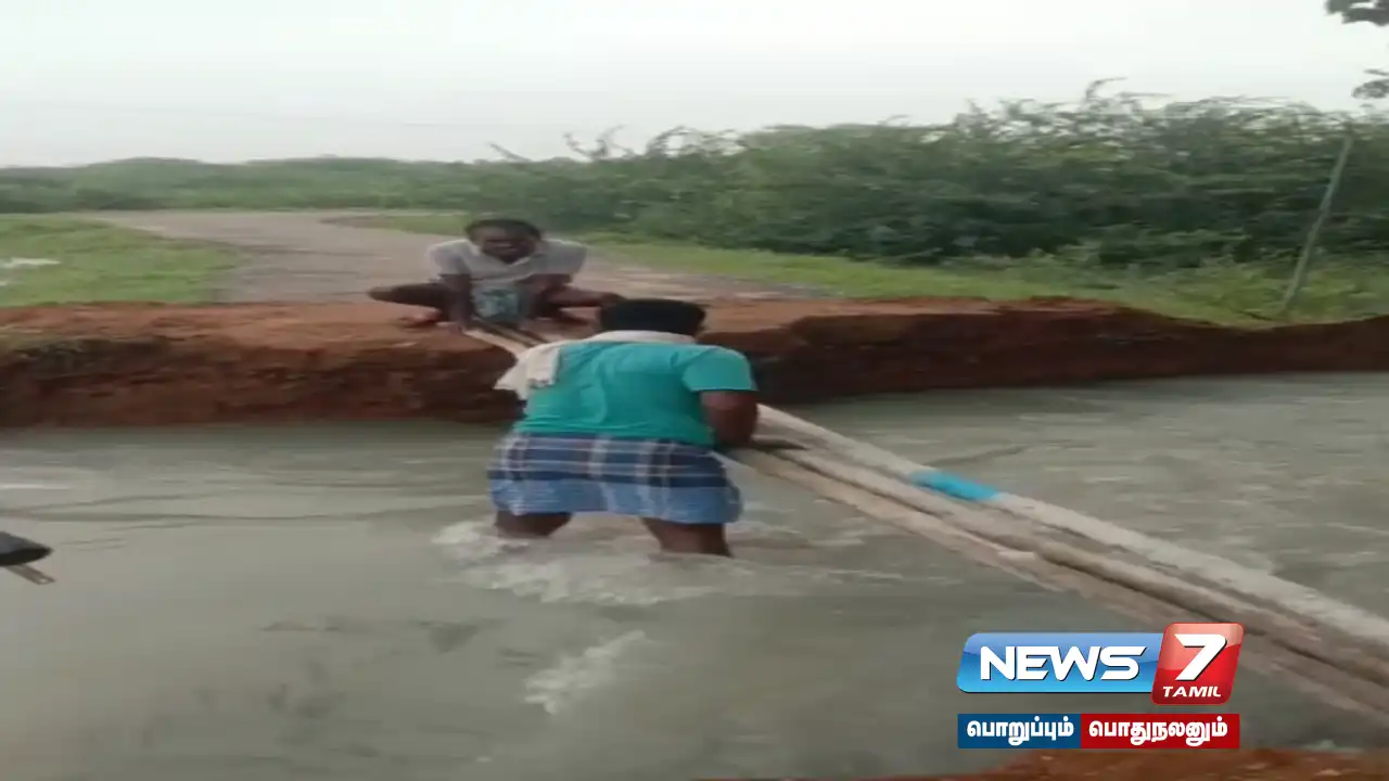 செல்லும் சாலையை வெள்ளநீர் சூழ்ந்து அடித்து செல்லப்பட்டது. இதனால்,அப்பகுதி மக்கள் கம்பிகளை வைத்து தற்காலிக பாலம் அமைத்து ஆபத்தான முறையில் அதனை கடந்து சென்று வருகின்றனர்.