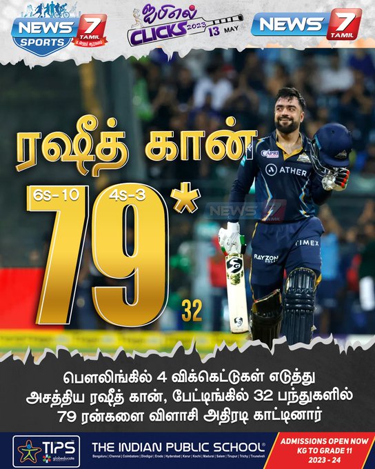 இதன் பின்னர் களமிறங்கிய சூர்யகுமார் யாதவ் விஷ்ணு வினோத் ஜோடி நிலைத்து ஆடிய நிலையில் சூர்யகுமார் அதிரடியாக ஆடி 6 சிக்சர்கள் விளாசி தனது முதல் சதத்தை பதிவு செய்தார். நிர்ணயிக்கப்பட்ட 20 ஓவர் முடிவில் 5 விக்கெட்டுகளை இழந்த மும்பை அணி 218 ரன்களை எடுத்தது. குஜராத் அணி தரப்பில் ரஷீத்கான் 4 அதிரடியாக 4 முக்கிய விக்கெட்டுகளை வீழ்த்தினார்.