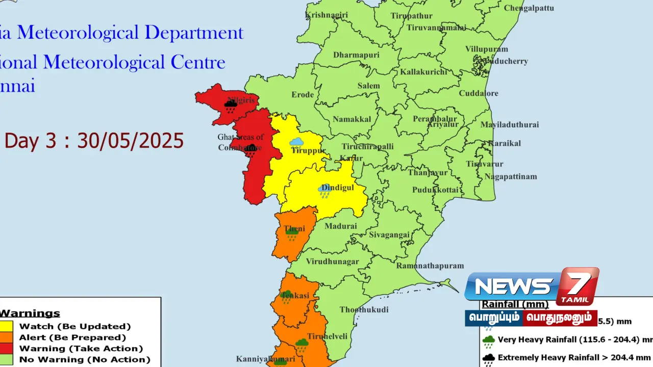 மேலும் இன்று (மே 28) நீலகிரி, கோவை, தேனி, தென்காசி, திருநெல்வேலி ஆகிய 5 மாவட்டங்களில் மிக கனமழை பெய்யும் எனவும் குமரி, திருப்பூர், திண்டுக்கல் மாவட்டங்களில் கனமழை பெய்யும் எனவும் சென்னை வானிலை ஆய்வு மையம் கூறியுள்ளது.