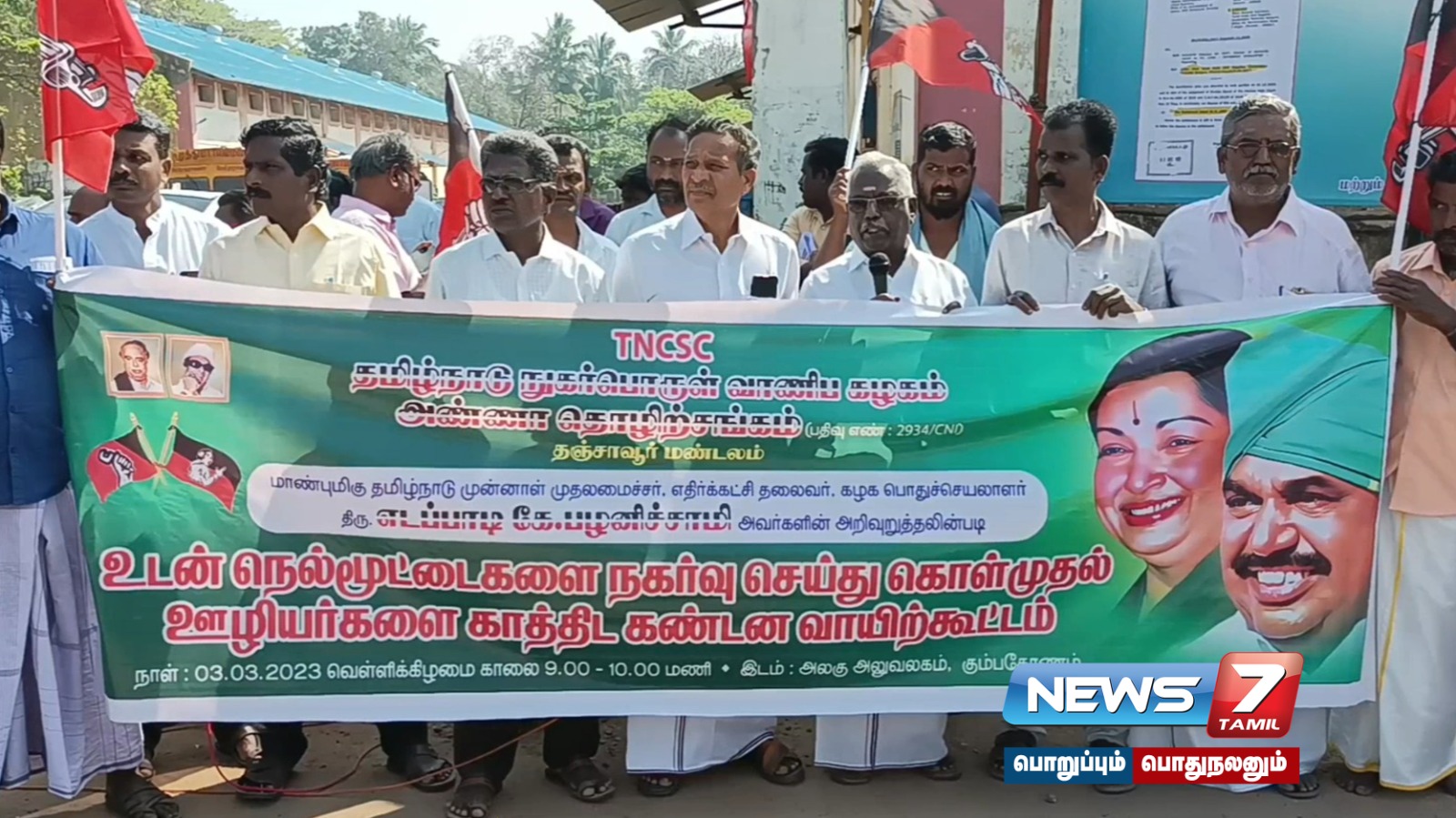 நேரடி நெல் கொள்முதல் நிலையங்களில் தேங்கியுள்ள நெல் மூட்டைகளை உடனடியாக அகற்றக் கோரியும், தேவையான இடங்களில் திறந்த வெளி நெல் சேமிப்பு கிடங்குகள் அமைக்க வலியுறுத்தியும் கும்பகோணத்தில் உள்ள தமிழ்நாடு நுகர்பொருள் வாணிபக் கழக மண்டல மேலாளர் அலுவலகம் முன் இன்று அண்ணா தொழிற்சங்கத்தினர் ஆர்ப்பாட்டம் நடத்தினர்.