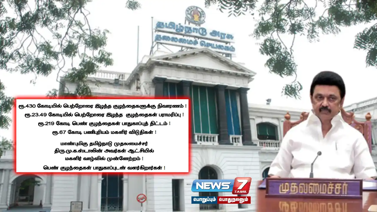 “ரூ.430 கோடியில் பெற்றோரை இழந்த குழந்தைகளுக்கு நிவாரணம், ரூ.23.49 கோடியில் பெற்றோரை இழந்த குழந்தைகள் பராமரிப்பு, ரூ.219 கோடி பெண் குழந்தைகள் பாதுகாப்புத் திட்டம், ரூ.67 கோடி பணிபுரியம் மகளிர் விடுதிகள்… தமிழ்நாடு முதலமைச்சர் மு.க.ஸ்டாலின் ஆட்சியில் மகளிர் வாழ்வில் முன்னேற்றம்… பெண் குழந்தைகள் பாதுகாப்புடன் வளர்கிறார்கள்…