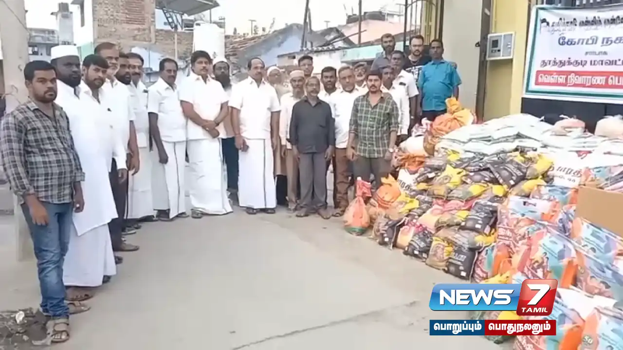 மாவட்ட தலைவர் சம்சுதீன் தலைமையில் 1000 குடும்பங்களுக்கு தேவையான அரிசி, பருப்பு உள்ளிட்ட மளிகை பொருட்களை தூத்துக்குடி மாவட்டத்திற்கு வாகனங்கள் மூலம் அனுப்பி வைக்கப்பட்டது. மேலும் மாநில செயற்குழு உறுப்பினர் பயாசுதீன், திமுக நெசவாளர் அணியின் மாநில செயலாளர் சிந்து ரவிச்சந்திரன், கோபி நகர்மன்ற தலைவர் நாகராஜ் ஆகியோர் உடன் இருந்தனர்.