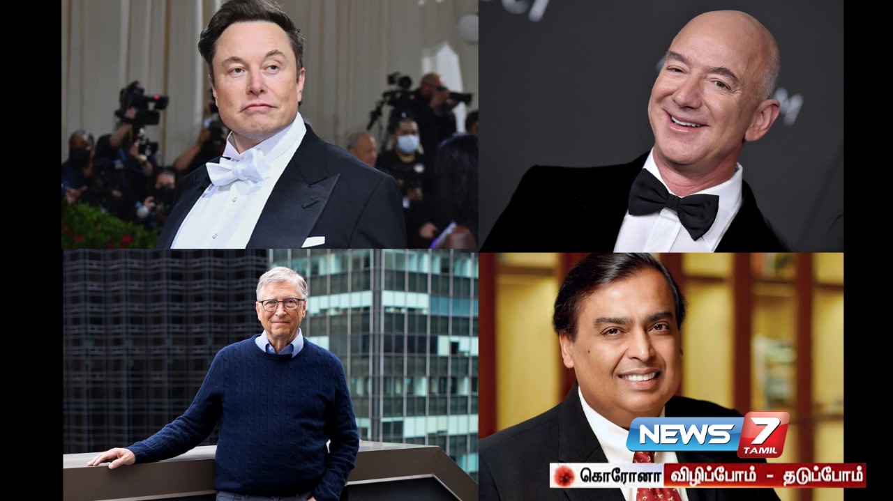 உலக அளவில் பணக்காரர்கள் வரிசையில் முதலிடத்தில் டெஸ்லா நிறுவனத்தின் எலான் மஸ்க் உள்ளார். அவரின் சொத்து மதிப்பு 227 பில்லியன் டாலர். அமேசான் நிறுவனத்தின் ஜெஃப் பிஜாஸ் , 149 பில்லியன் டாலர் சொத்து மதிப்புடன் இரண்டாவது இடத்தில் உள்ளார். மைக்ரோசாப்ட் நிறுவனத்தின் பில்கேட்ஸ் 4 வது இடம், வார்ரன் பஃபட் 5 வது இடம், ரிலையன்ஸ் நிறுவனத்தின் முகேஷ் அம்பானி 8 வது இடம், அதானி குழுமத்தின் கவுதம் அதானி 9 இடம் மற்றும் மெடா நிறுவனத்தின் மார்ஜ் ஜூக்கர்பெர்க் 13 வது இடத்திலும் உள்ளனர்.