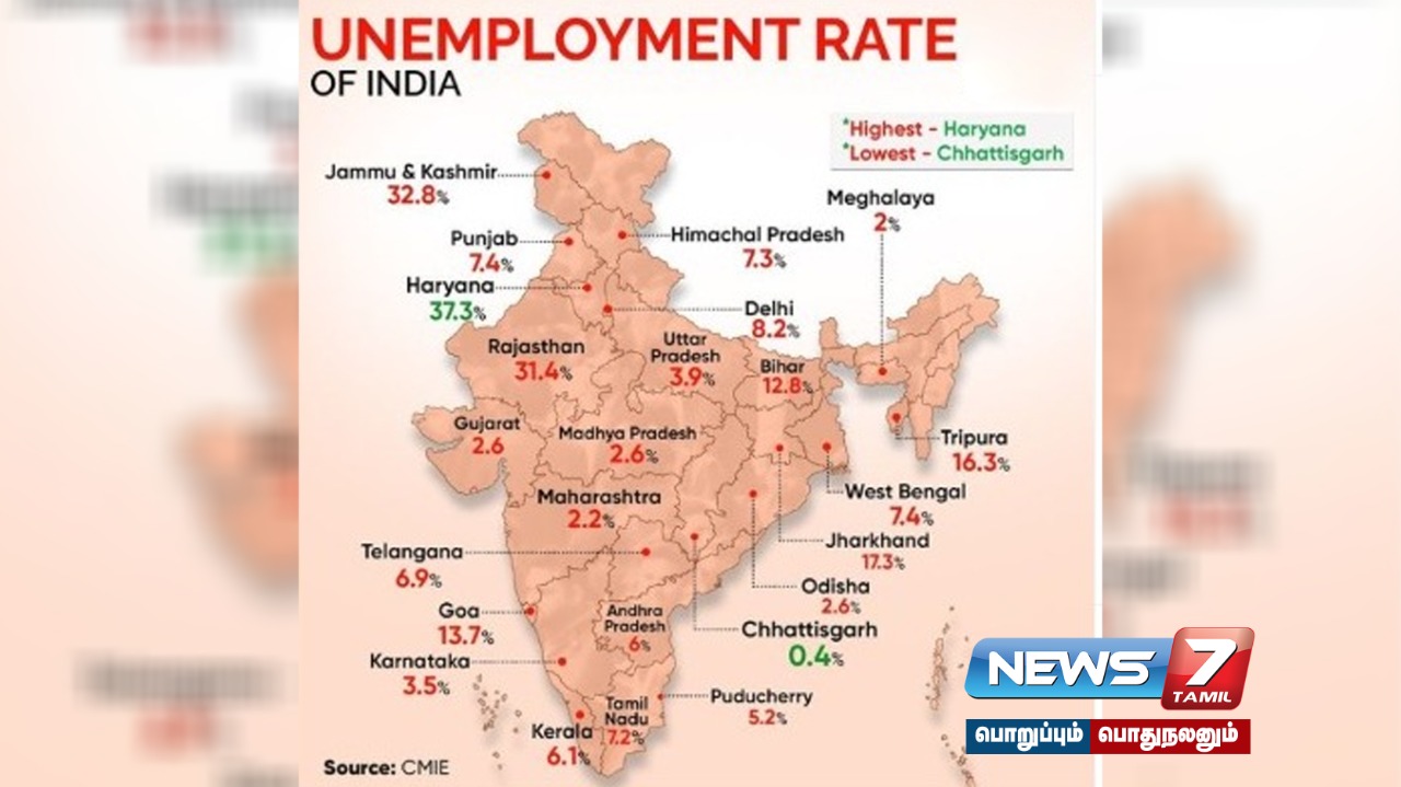 இந்தியாவில் வேலைவாய்ப்பின்மை ஹரியானாவில் 37.3%, ஜம்மு காஷ்மீரில் 32.8%, பஞ்சாப்பில் 7.4%, ஹிமாச்சல் பிரதேசம் 7.3%, ராஜஸ்தான் 31.4%, உத்தரபிரதேசம் 3.9%, டெல்லி 8.2%, பீகார் 12.8%, குஜராத் 2.6%, மத்திய பிரதேசம் 2.6%, திரிபுரா 16.3%, மேற்குவங்காளம் 7.4%, ஜார்கண்ட் 17.3%, ஒடிசா 2.6%, சத்திஸ்கர் 0.4 சதவீதம், மகாராஷ்டிரா 2.2%, தெலங்கானா 6.9%, கோவா 13.7%, கர்நாடகா 3.5%, ஆந்திரா 6%, புதுச்சேரி 5.2%, கேரளா 6.1%, தமிழ்நாடு 7.2 சதவிகிதமாகவும் உள்ளது.