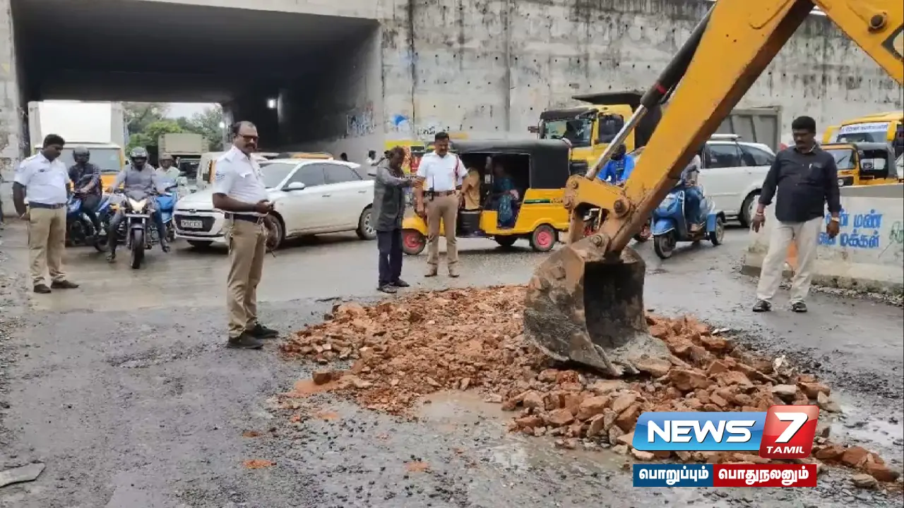 உள்ளிட்ட சந்திப்புகளிலும் ஏற்பட்ட ராட்சத பள்ளங்களை போக்குவரத்து போலீசாரே