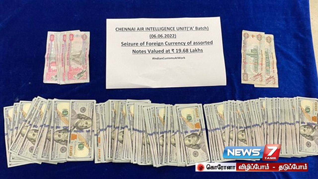 சென்னையில் இருந்து துபாயிக்கு விமானத்தில் கடத்த முயன்ற ரூ. 19 லட்சத்தி 68 ஆயிரம் மதிப்புள்ள வெளிநாட்டு கரன்சிகள் சுங்கத்துறை அதிகாரிகள் பறிமுதல் செய்துள்ளனர்.