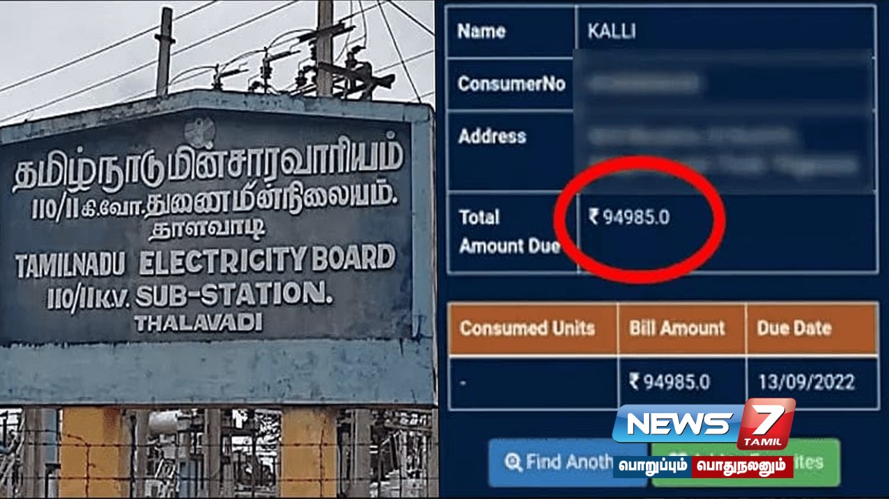 100 யூனிட் வரை இலவச மின்சாரம் என்பதால் இதுவரை ரேவண்ணா மின் கட்டணம் செலுத்தியது இல்லை. இந்நிலையில் அவரது செல்போன் எண்ணிற்கு மின் கட்டணம் ரூ. 94,985 செலுத்துமாறு மெசேஜ் ஒன்று வந்துள்ளது. இதைப் பார்த்து அதிர்ச்சி அடைந்த ரேவண்ணா உடனடியாக தாளவாடி மின்வாரிய அலுவலகத்திற்குச் சென்று இதுகுறித்து அதிகாரிகளிடம் கூறியுள்ளார்.