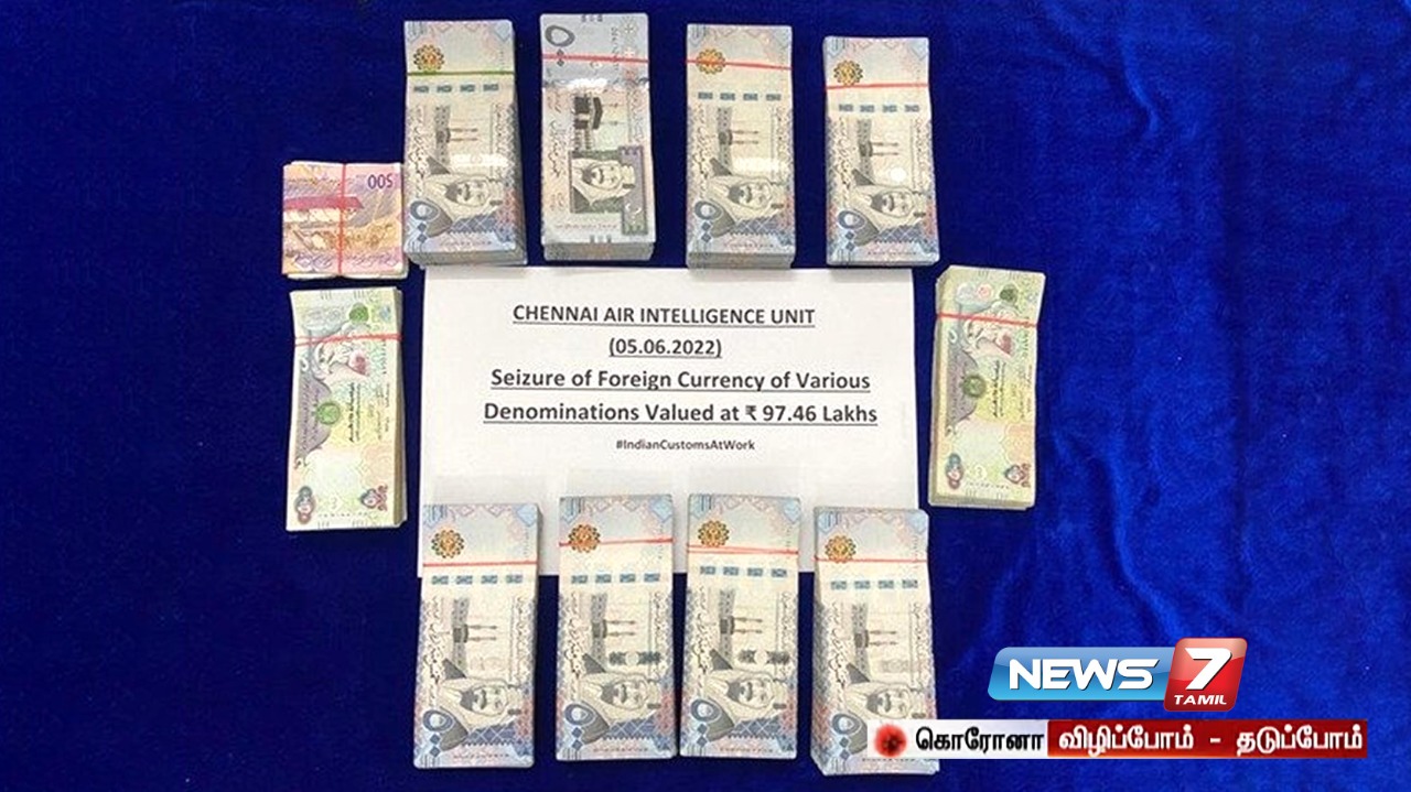 சென்னையில் இருந்து ஷார்ஜாவிற்கு விமானத்தில் கடத்த முயன்ற ரூ. 97 லட்சத்தி 46 ஆயிரம் மதிப்புள்ள வெளிநாட்டு கரன்சிகளை சுங்கத்துறை அதிகாரிகள் பறிமுதல் செய்தனர்.