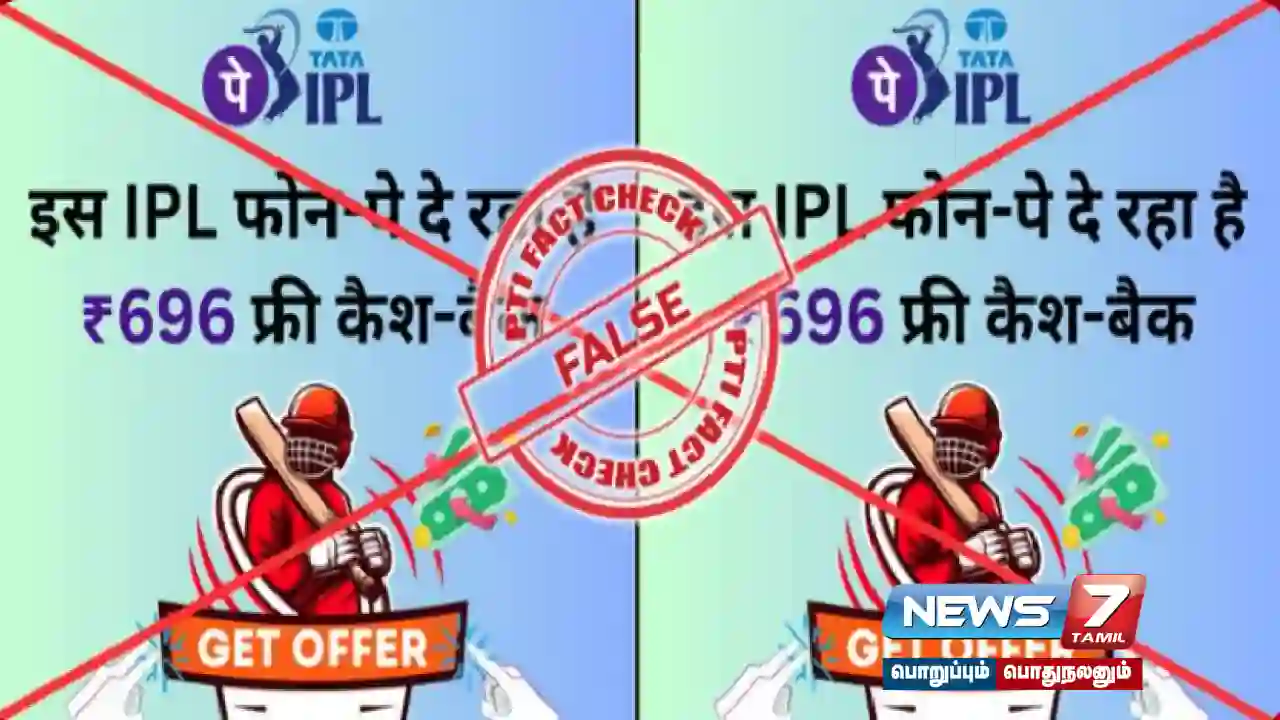 இந்த ஐபிஎல் சீசனில் ரூ.696 கேஷ்பேக் வழங்குவதாகக் கூறி பல சமூக ஊடக பயனர்கள் ஃபோன்பே பெயரில் ஒரு பதிவைப் பகிர்ந்துள்ளனர். டெஸ்க் தனது விசாரணையில், இந்த வைரல் பதிவு தவறானது என்று கண்டறிந்தது, ஏனெனில் நடப்பு ஐபிஎல் சீசனுக்காக ஃபோன்பே எந்த கேஷ்பேக் சலுகையையும் வழங்கவில்லை. மேலும், பகிரப்பட்ட இணைப்புகள் மோசடி பக்கங்களுக்கு வழிவகுக்கின்றன.