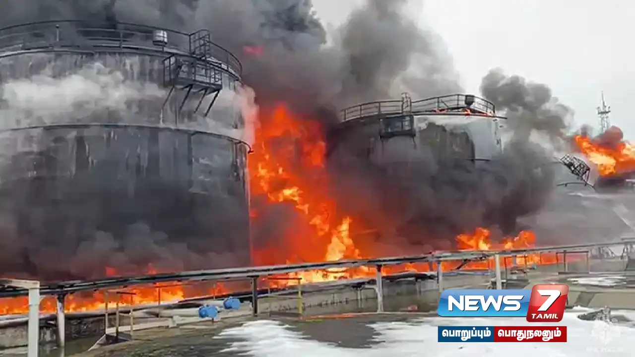 உக்ரைன் மீது ரஷ்யா கடந்த 2022 ஆம் ஆண்டு பிப்ரவரி 24 ஆம் தேதி போர் தொடுத்தது. இரண்டு ஆண்டுகளை நெருங்கியுள்ள இந்த போர், தொடர்ந்து நடைபெற்று வருகிறது. இந்நிலையில், நேற்று ஆளில்லாத விமானம் மூலம் ரஷ்யாவின் எண்ணெய் கிடங்குகளின் மீத் உக்ரைன் தாக்குதல் நடத்தியுள்ளது. இதில் 6000 கனமீட்டர் கொள்ளளவுடைய நான்கு எண்ணெய் கிடங்குகள் தீப்பற்றியதாகவும், இந்த தீ 1000 சதுர மீட்டர் பரவியதாகவும் ரஷ்யா தெரிவித்துள்ளது.
