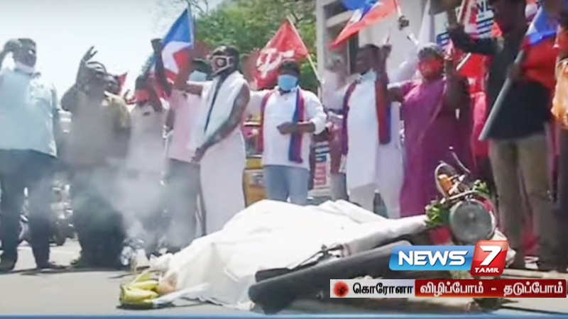பெட்ரோல் விலை உயர்வால் சாமானிய மக்கள் இருசக்கர வாகனத்தை பயன்படுத்த முடியாத நிலை ஏற்பட்டுள்ளதாக கூறி வாகனத்திற்கு பாடை கட்டி ஆர்ப்பாட்டத்தில் ஈடுபட்டனர். தொடர்ந்து பெண்கள் ஒப்பாரி வைத்து நூதன முறையில் தங்கள் எதிர்ப்பை வெளிப்படுத்தினர்.