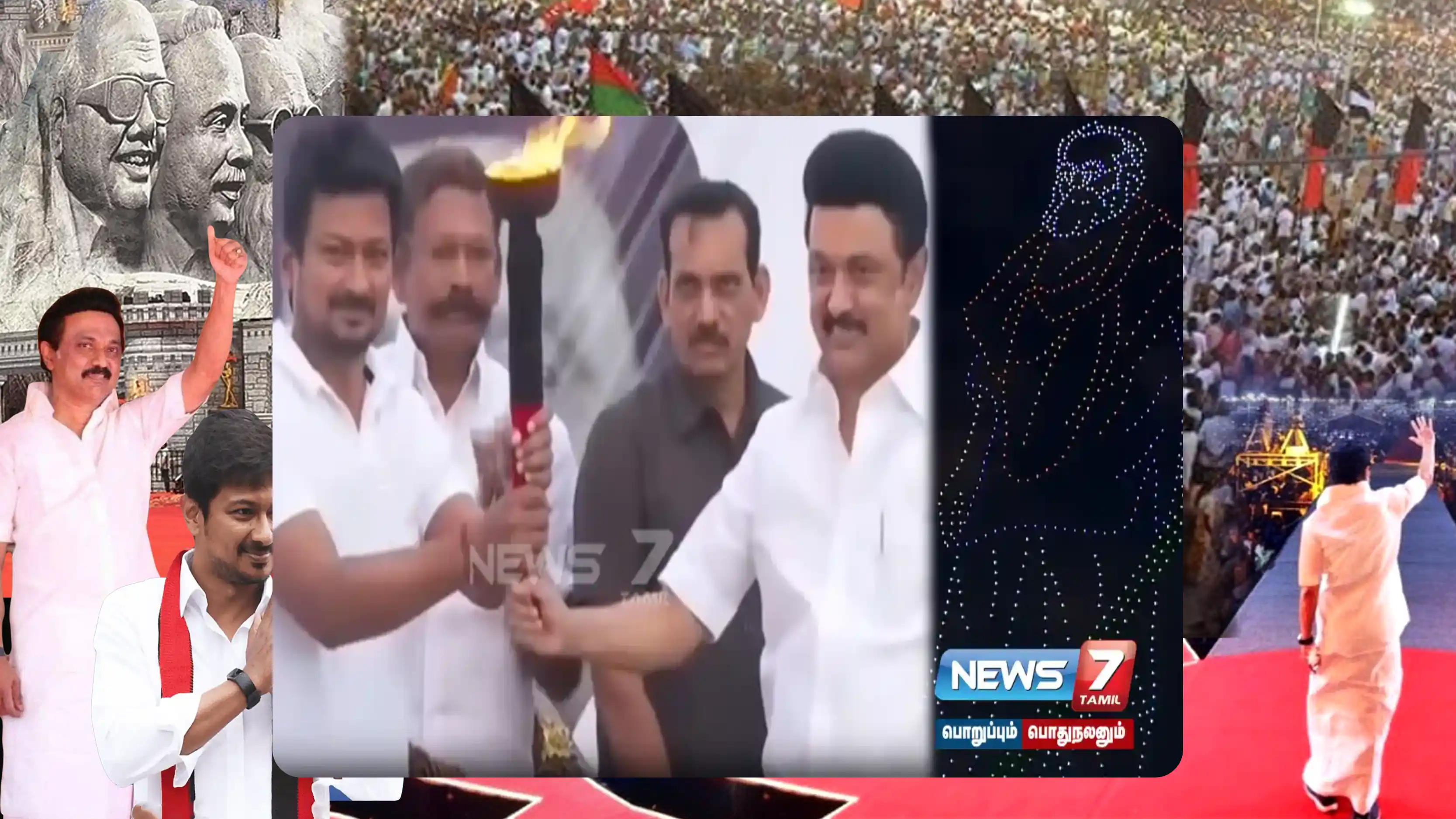 ஒற்றை செங்கலை தூக்கி நிற்கும் உதயநிதி ஸ்டாலின் உருவம் ட்ரோன்களில் காட்சிப்படுத்தப்பட்டது. தமிழ் வெல்லும் என முன்னாள் முதலமைச்சர் கருணாநிதியின் கையெழுத்து மற்றும் பேனா வடிவம் ட்ரோன்கள் மூலம் தத்துரூபமாக காட்சிப்படுத்தப்பட்டன.