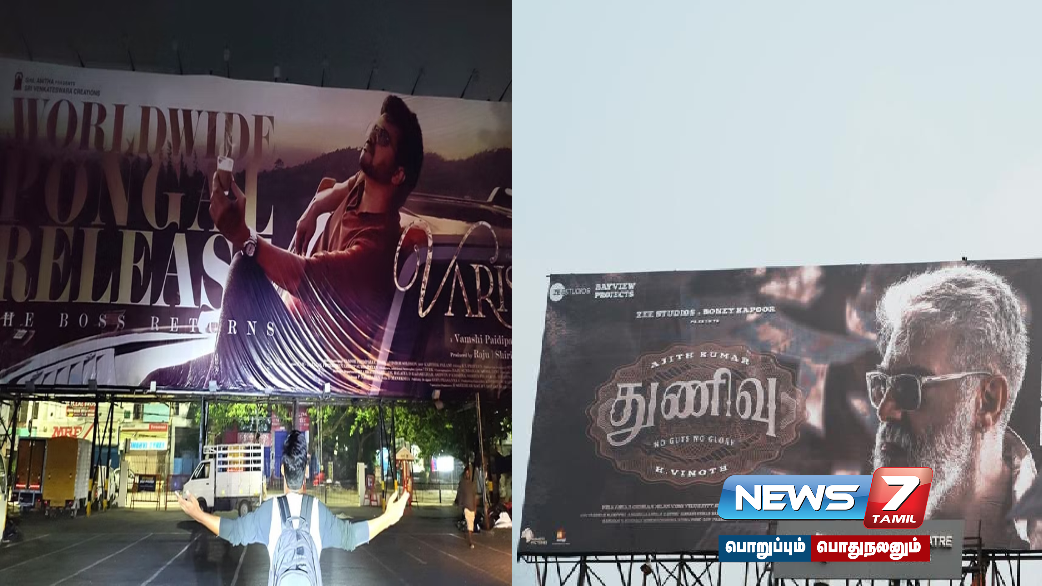 வாரிசு, துணிவு ஆகிய இருதிரைப்படங்களும் ஒரே நாளில் வெளியாக இருப்பதால் விஜய் மற்றும் அஜித் ரசிகர்கள் திரையரங்கு முன்பு பேனர்களை வைக்கும் பணியில் மும்முரமாக ஈடுப்பட்டு வருகின்றனர்.