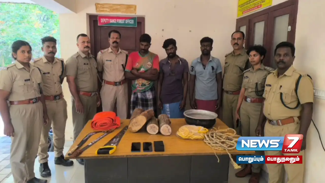 இந்த நிலையில், இந்த சம்பவத்தில் ஈடுபட்டது தமிழகத்தை சேர்ந்த நபர்கள் என்பது தெரியவரவே, கேரளா வனத்துறையினர் கடந்த சில தினங்களாக தமிழக, கேரள எல்லைப் பகுதியில் உள்ள புளியரை பகுதியில் முகாமிட்டு தீவிர விசாரணை நடத்தி வந்தனர். சந்தன மரங்களை வெட்டிய புளியரை பகுதியை சேர்ந்த மணிகண்டன், அஜித்குமார், குமார் ஆகிய 3 நபர்களையும் தற்போது கேரளா வனத்துறையினர் கைது செய்துள்ள நிலையில், அவர்களிடம் இருந்து சந்தன மரக் கட்டைகள் மற்றும் அதனை வெட்ட பயன்படுத்திய வாள் உள்ளிட்ட பொருட்கள் பறிமுதல் செய்யப்பட்டுள்ளது.