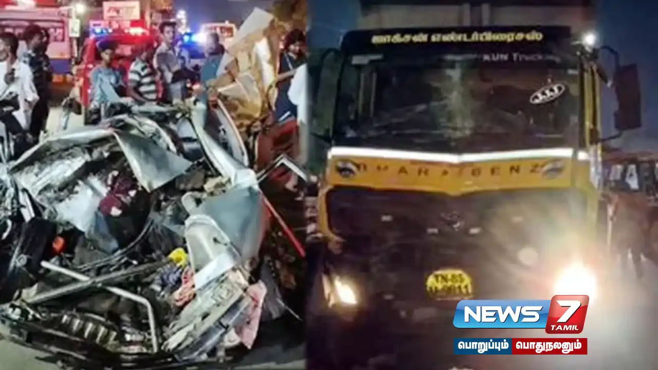 மேலும், காரில் பயணம் செய்த கார்த்திக், நந்தினி, நந்தினியின் தாயார் தெய்வபூஞ்சாரி மற்றும் ஓரு வயது குழந்தை சாய்வேலன், 7 வயது சிறுமி இளமதி ஆகியோர் படுகாயமடைந்தனர். அருகில் இருந்தவர்கள் இவர்களை மீட்டு செங்கல்பட்டு அரசு மருத்துவ கல்லூரி மருத்துவமனைக்கு அனுப்பி வைத்தனர்.
