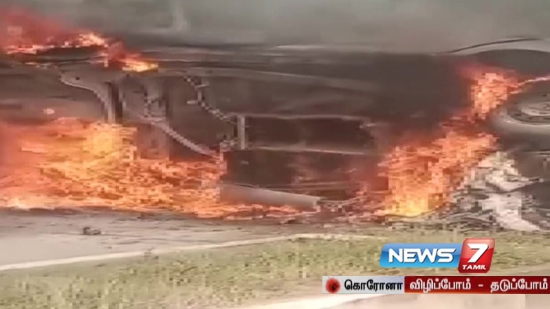 சந்திரகிரி பகுதியில் உள்ள புத்தளப்பட்டு-நாயுடுபேட்டை சாலையில் கார் வந்துகொண் டிருந்த போது, வளைவில் திரும்ப முற்பட்டது. வேகமாக வந்ததால் சாலை நடுவில் இருந்த தடுப்பில் திடீரென மோதியது. இதில் நிலை தடுமாறி கார் கவிழ்ந்தது. அடுத்த நொடியே எரிபொருள் கசிந்ததில் தீப்பற்றி எரிந்தது. தகவலறிந்து வந்த போலீசார், தீயை போராடி அணைத்தனர்.