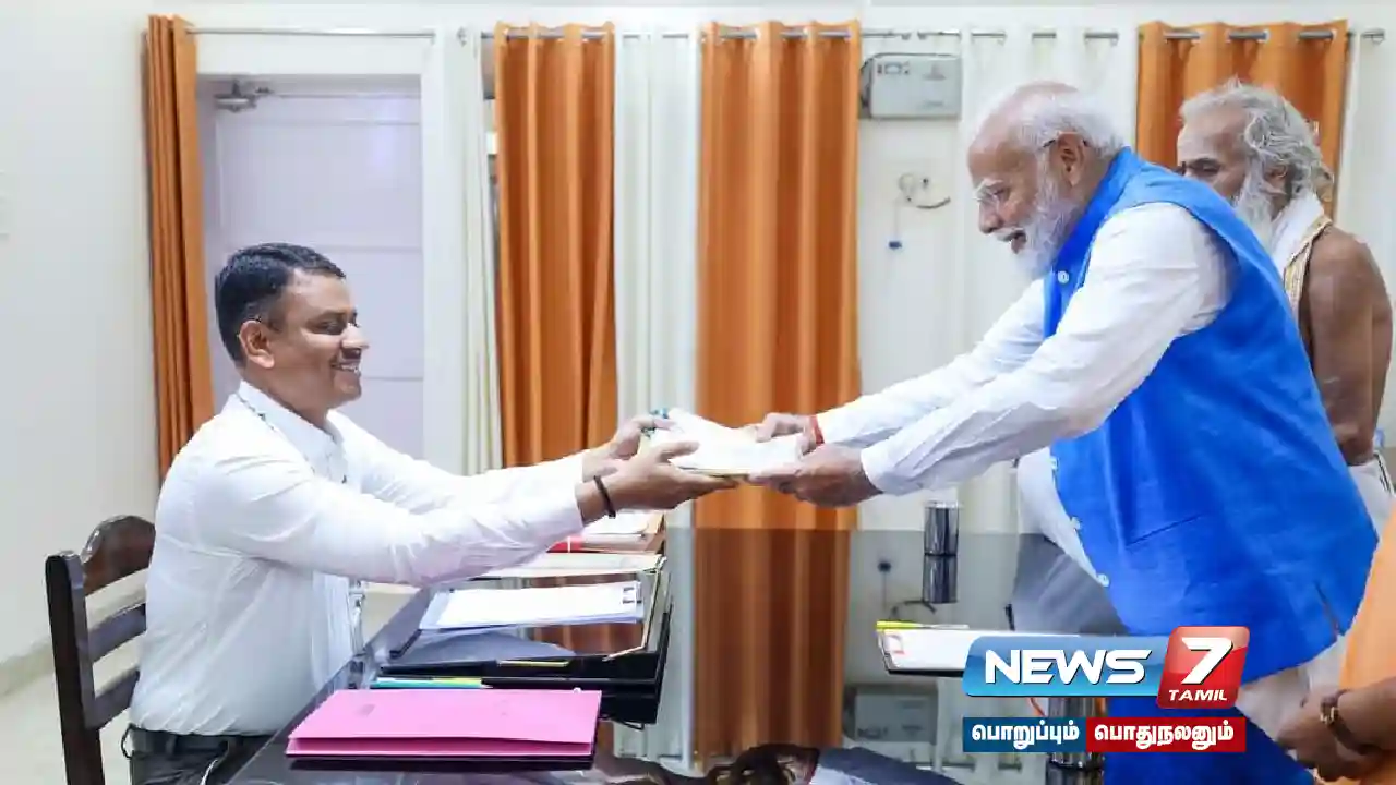பிரதமர் மோடி வாரணாசி தொகுதியில் தேர்தல் அதிகாரியும், வாரணாசி மாவட்டத்தின் ஆட்சியருமான ராஜலிங்கத்திடம் வேட்புமனு தாக்கல் செய்த புகைப்படம் சமூக வலைதளங்களில் வைரலாகி வருகிறது.