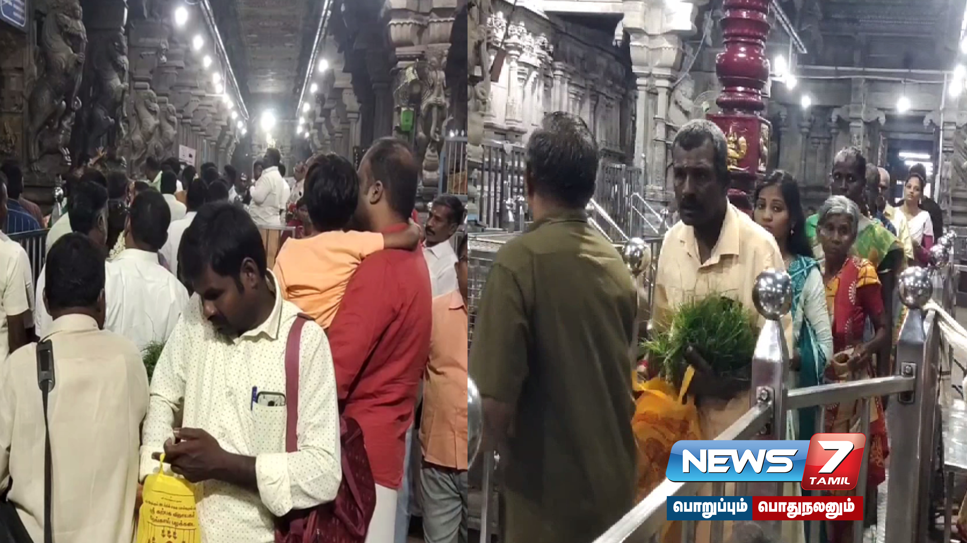 தமிழ் புத்தாண்டையொட்டி ராமேஸ்வரம் அக்னி தீர்த்த கடலில் ஏராளமான பக்தர்கள் புனித நீராடினர். தொடர்ந்து ராமநாதசுவாமி கோயிலில் நீண்ட வரிசையில் காத்திருந்து சாமி தரிசனம் செய்தனர்.