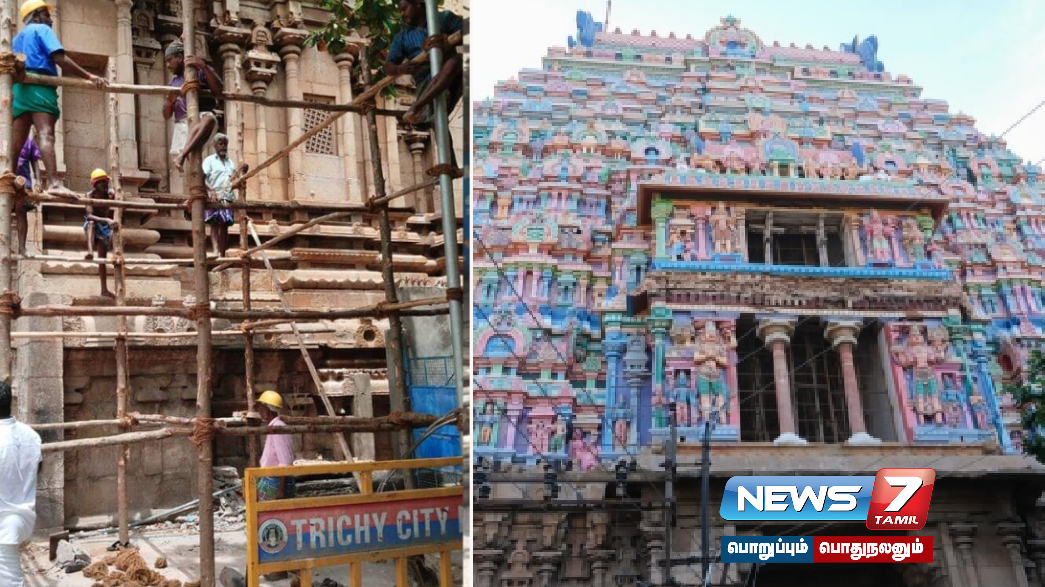 திருச்சி ஸ்ரீரங்கம் கோயிலின் கிழக்கு நுழைவு வாயிலில் உள்ள கோபுரத்தின் ஒரு பகுதி இடிந்து விழுந்த நிலையில், கோபுரத்தில் சீரமைப்பு பணிகளை மேற்கொள்வதற்கான சாரம் கட்டும் பணிகள் தொடங்கின.