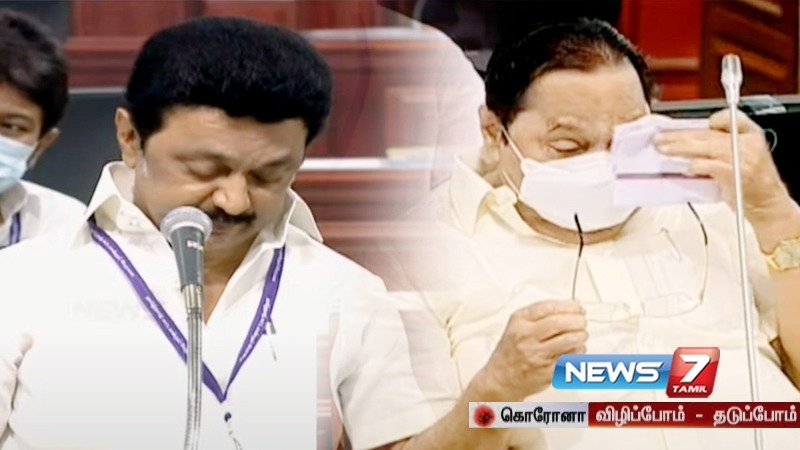 இந்நிகழ்வின் தொடக்கத்தில் பேசிய முதலமைச்சர் மு.க.ஸ்டாலின், நீர்வளத்துறையின் சார்பில் முதல் மானியக்கோரிக்கை தாக்கல் செய்வதில் மகிழ்ச்சியடைவதாக தெரிவித்தார். நூற்றாண்டு கண்ட சட்டப்பேரவையில் அரைநூற்றாண்டுக்கு முன் வந்த துரைமுருகன், கருணாநிதி, அன்பழகன் மறைவுக்கு பிறகு தனக்கு வழிகாட்டியாக இருப்பதாகவும் கூறினார். தொடர்ந்து பேசிய முதலமைச்சர் மு.க.ஸ்டாலின், சட்டப்பேரவையில் பொன்விழா நாயகராக துரைமுருகன் திகழ்வதாக பாராட்டி தீர்மானம் கொண்டு வந்தார். முதலமைச்சர் பேசியதை கண்டு நீர்வளத்துறை அமைச்சர் துரைமுருகன், கண்கலங்கினார்.