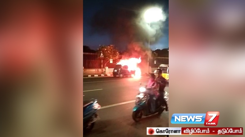 சென்னை காமராஜர் சாலையில் ஓடும் கார் திடீரென தீப்பற்றி எரிந்ததால் பரபரப்பு ஏற்பட்டது.