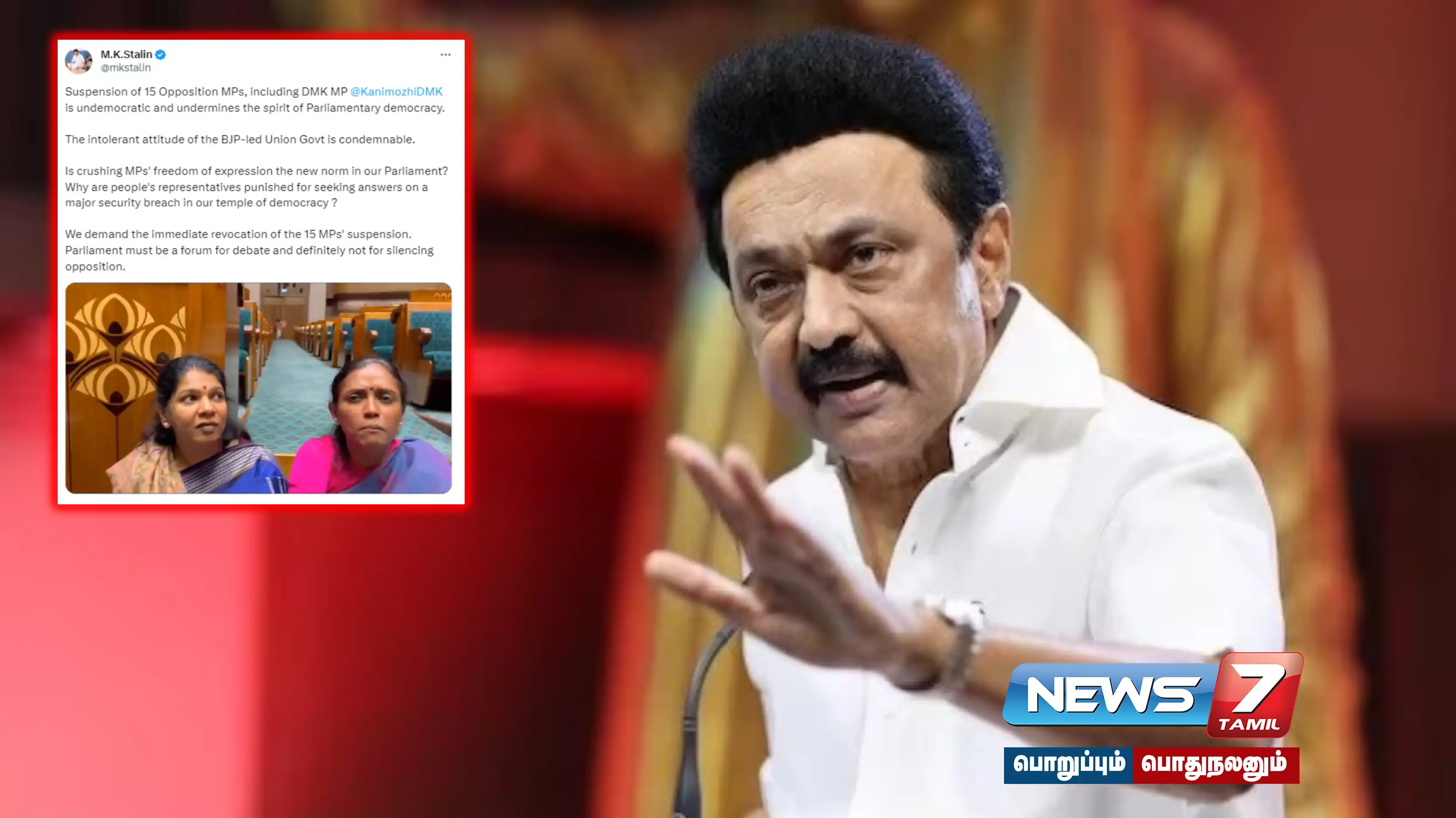 மேலும் சஸ்பெண்ட் செய்யப்பட்ட எம்.பி.க்கள் மக்களவையில் தரையில் அமர்ந்து போராட்டத்தில் ஈடுபட்டனர். அவர்கள் நீதி வேண்டும் என்ற கோஷங்களை எழுப்பினர். இந்நிலையில் தமிழ்நாடு முதலமைச்சர் மு.க.ஸ்டாலின் தனது ட்விட்டர் (எக்ஸ்) பக்கத்தில் இந்த விவகாரம் தொடர்பாக தனது கண்டனத்தை பதிவிட்ட்டுள்ளார். அதில் கூறியதாவது: