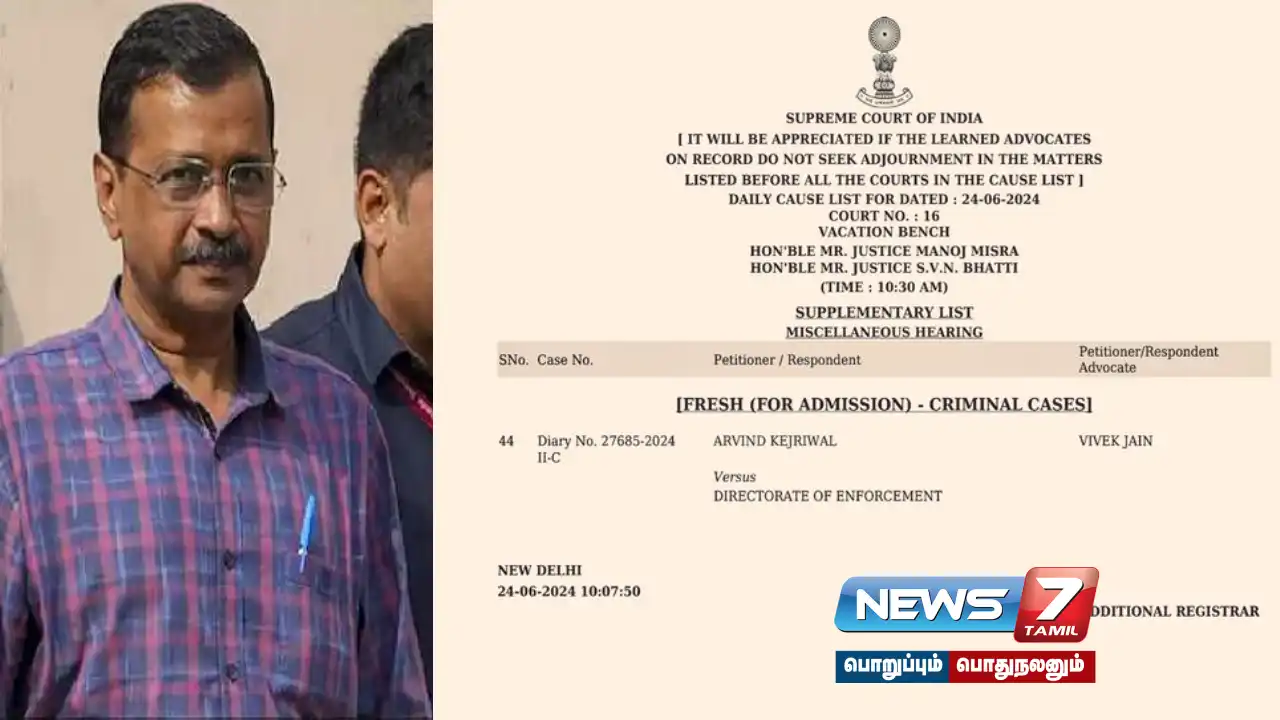 மதுபான கொள்கை வழக்கில் ஜாமினை நிறுத்தி வைத்த டெல்லி உயர்நீதிமன்ற உத்தரவை எதிர்த்து அரவிந்த் கெஜ்ரிவால் தாக்கல் செய்த மனுவை நீதிபதி மனோஜ் மிஸ்ரா தலைமையிலான உச்சநீதிமன்ற அமர்வு இன்று விசாரிக்கிறது.