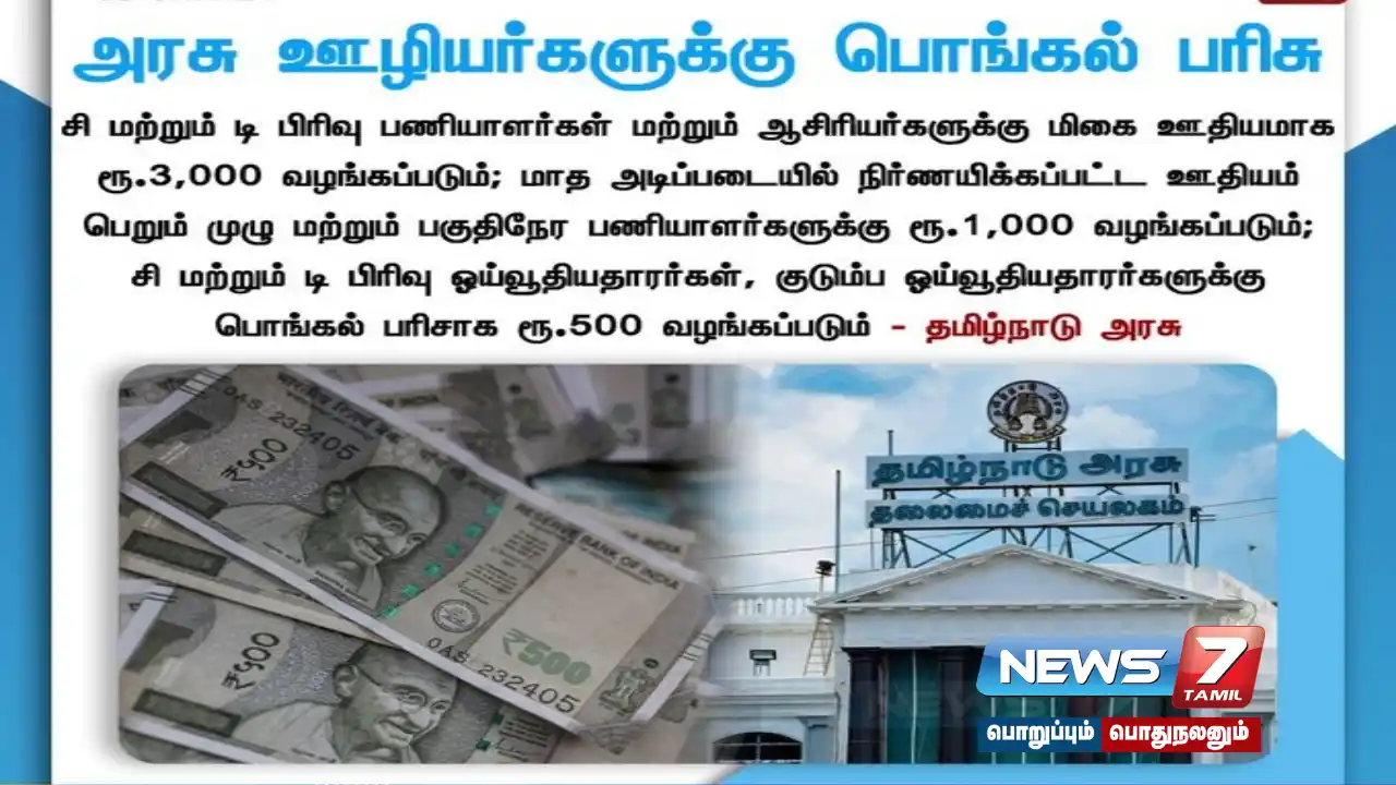 அரசு ஊழியர்கள் மற்றும் ஆசிரியர்களுக்கு தமிழ்நாடு அரசு பொங்கல் பரிசு அறிவித்துள்ளது. பொங்கலுக்கு ரேஷன் அட்டைதாரர்களுக்கு ரூ.1000 அறிவிக்கப்பட்ட நிலையில், தற்போது அரசு ஊழியர்களுக்கு பரிசு அறிவிக்கப்பட்டிருக்கிறது.