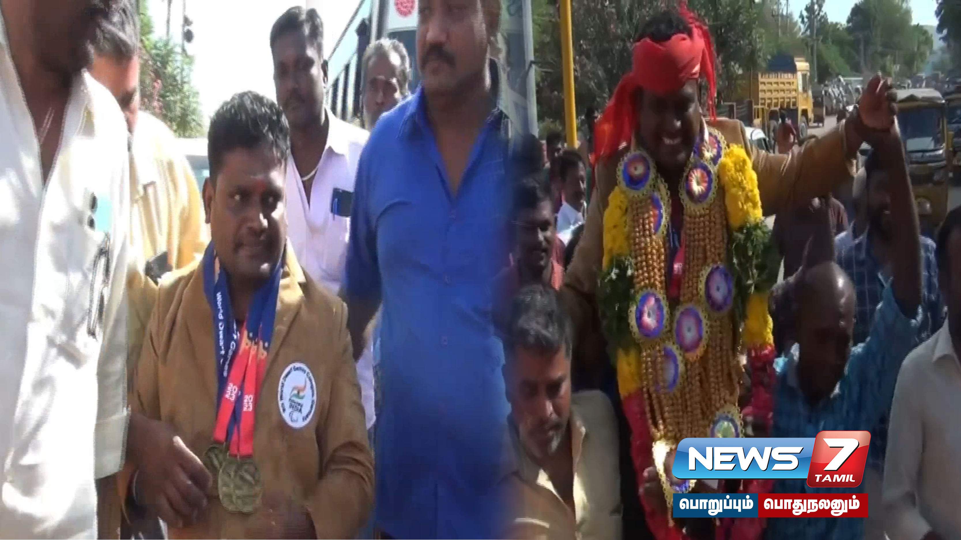 ஜெர்மனியில் நடைபெற்ற உயரம் குன்றியவர்களுக்கான தடகள போட்டியில் 3 தங்க பதக்கங்களை வென்று சொந்த ஊர் வந்த கணேசனுக்கு, அவரது உறவினர்கள் மேள தாளம் முழங்க தோளில் தூக்கி சென்று உற்சாக வரவேற்பு கொடுத்தனர்.